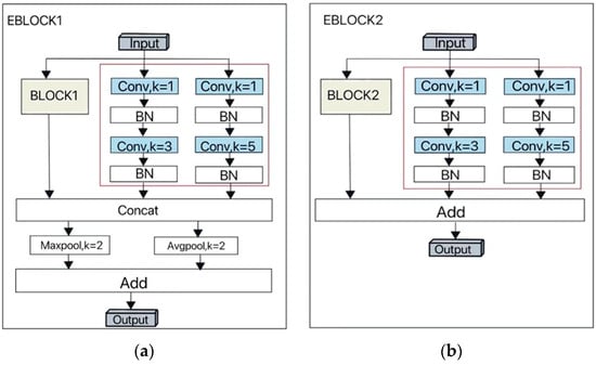 Model Improvement: (a) improved EBLOCK1 module; (b) improved EBLOCK2 module.