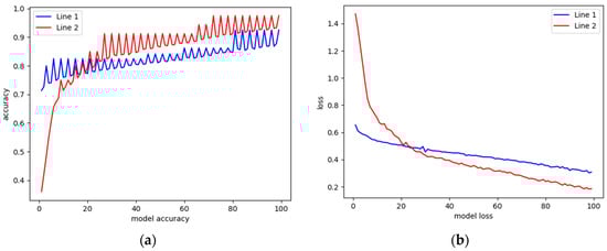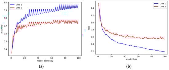 Recognition Result of Experiment 1: (a) model accuracy; (b) model loss.