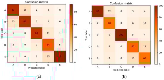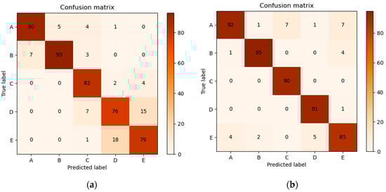 Confusion matrix of Experiment 4: (a) same audio recognition result; (b) different audio recognition result.