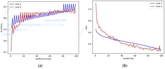 The model is first trained using the samples, and the experimental results of the training are shown in Figure 8 and Figure 9, with fold line 1 showing the accuracy and loss of training the model with the same audio samples at point X, and fold line 2 showing the accuracy and loss of training the model with different audio samples at point X.