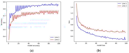 First, the model is trained by using samples. The experimental results of the training are shown in Figure 15 and Figure 16. Fold line 1 is the accuracy and loss of training the same audio sample model at point Y, and fold line 2 is the accuracy and loss of training different audio sample models at point Y.