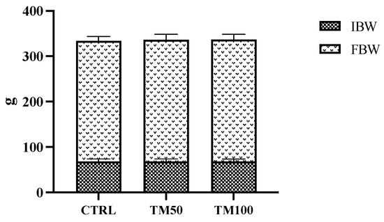 Final body weight (g) of European seabass fed the experimental diets for 16 weeks. The abbreviations are IBW—initial body weight and FBW—final body weight.