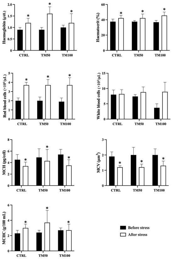 Partial and total FM replacement by dTM did not significantly affect haemoglobin, haematocrit, red and white blood cells, mean corpuscular volume, mean corpuscular haemoglobin, or mean corpuscular haemoglobin concentration (Figure 2). On the other hand, haemoglobin, haematocrit, red blood cells, and mean corpuscular haemoglobin concentration significantly increased after the acute stress challenge, while mean corpuscular volume and mean corpuscular haemoglobin decreased, regardless of the dietary treatment (Figure 2).
