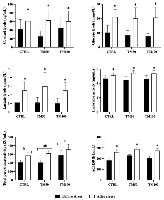 After the acute stress challenge, and irrespective of the dietary treatment, European seabass exhibited a significant increase in plasma cortisol, glucose, and lactate levels, coupled with a significant increase in lysozyme activity and ACH50 (Figure 3). On the other hand, the levels of peroxidase in the plasma of fish fed TM100 were significantly higher than those observed in fish fed CTRL, regardless of stress condition (Figure 3).