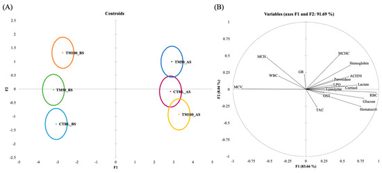 Canonical discriminant analysis of European seabass fed experimental diet before and after the acute stress challenge. (A) Canonical discriminant scores of each group. Coloured circles represent groups’ centroids. (B) Correlation variables/factors (factor loads) for two main discriminant functions (F1 and F2).