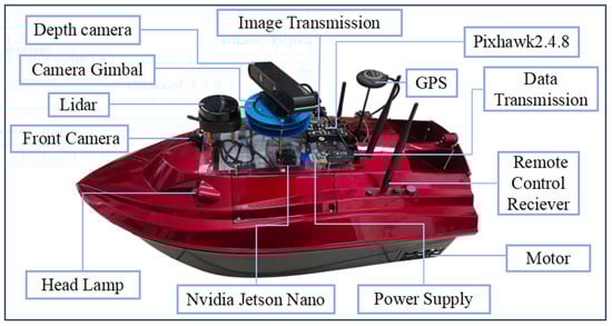 Unmanned surface vehicles (USVs), emerging as novel waterborne unmanned platforms, possess the capabilities for long-range, prolonged operations and can be outfitted with a variety of sensors onboard to fulfill specific tasks, thus finding extensive applications in recent years in fields such as marine exploration, environmental monitoring, and patrol inspections [,]. Xiong et al. [] devised a USV tailored for water quality assessment and investigated its trajectory control algorithm. Sotelo-Torres et al. [] elaborated on the development of a cost-effective and practical USV for lake depth measurement. This system integrates an autonomous navigation framework, environmental sensors, and multibeam sonar to collect data on underwater terrain, temperature, and wind speed. Cheng et al. [] amalgamated USVs with target detection algorithms for surface target identification, establishing a comprehensive USV-based surface target recognition system.