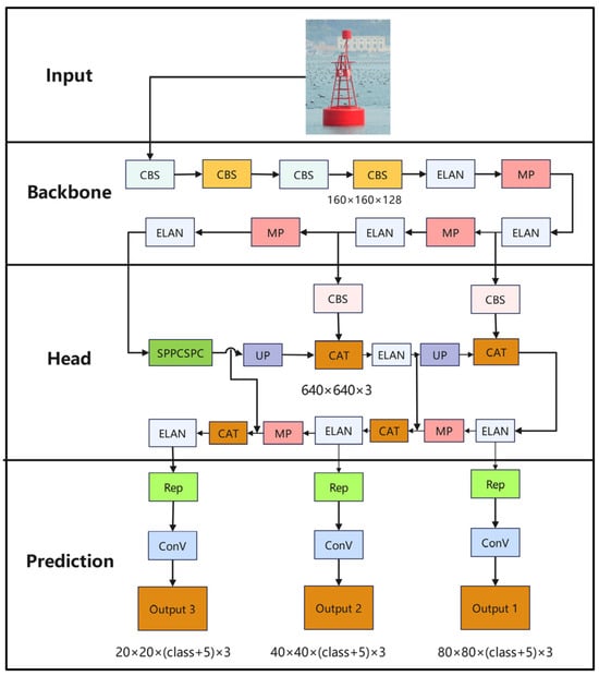 The architecture diagram for buoy detection based on YOLOv7, as shown in Figure 9 and Figure 10, comprises four main components: the Input layer, Backbone network, Head network, and Prediction layer.