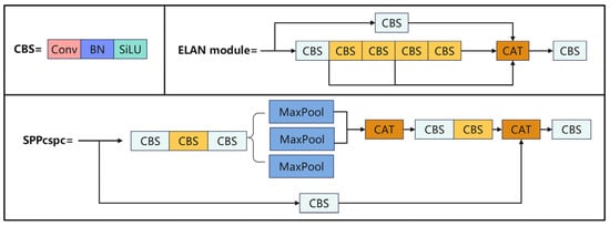 The input module of YOLOv7 adopts an adaptive anchor box calculation method, coupled with data concatenation and mixed augmentation techniques, to accommodate the requirement of 640 × 640 size dataset image inputs. The background network module comprises CBS, ELAN, and MP1 convolutional layers, tasked with extracting fundamental features, expanding receptive fields, and enhancing feature extraction capabilities, respectively. The Neck module integrates CBS, SPPCSPC, MP, and ELAN structures, extracting and merging feature information from different layers of the background network to enhance model performance.