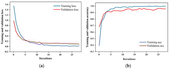 To facilitate a faster convergence to the optimal solution, Stochastic Gradient Descent (SGD) with a momentum term was selected as the optimization algorithm []. The inclusion of the momentum term helps to mitigate fluctuations in gradient updates to some extent, thereby stabilizing the training process and accelerating convergence. To assess model performance and conduct comparative analysis, experiments were not only conducted on the original dataset but also on a dataset subjected to contour enhancement. The contour-enhanced dataset aims to improve the model’s ability to recognize targets by enhancing the contour information of objects in the images. The experimental results are illustrated in Figure 17a,b (see below), which depict the loss and accuracy curves of the model on these two datasets.