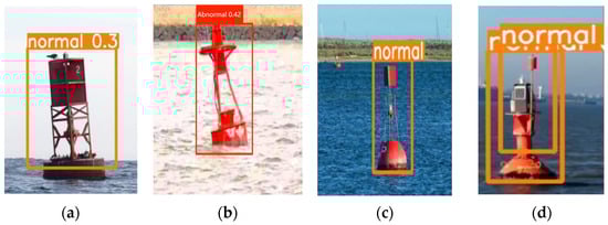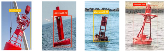 Figure 19 presents the detection results for buoys under abnormal conditions. It is observed that when buoys are tilted or damaged, they are identified by the target detection algorithm as anomalies. The outcomes of the detection align with the actual state of the buoys, demonstrating the algorithm’s applicability in real-world scenarios.