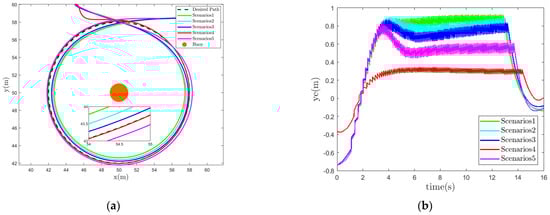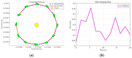 The path tracking performance and errors of the USV’s buoy circumnavigation motion control algorithm under the aforementioned five scenarios are shown in Figure 21a,b.