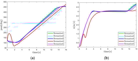 Based on the simulation results, it is evident that the best path tracking performance with the smallest lateral error occurs in the fourth scenario, where and , for the USV. An analysis of the other scenarios reveals that as the value of increases, meaning that the weight of in determining the final desired yaw angle increases, the actual path of the unmanned surface vehicle tends to be closer to the buoy, resulting in larger errors. In the fifth scenario, where , the final desired yaw angle of the USV is entirely determined by , corresponding to the traditional line-of-sight (LOS) guidance algorithm. A comparison between the fourth and fifth scenarios indicates that the modified LOS guidance algorithm outperforms the traditional LOS algorithm in the context of buoy circumnavigation path tracking, yielding a smaller lateral error . The changes in course angle and vessel speed across the five scenarios are shown in Figure 22a,b.