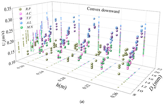 In these equations, , , , and . The R2 values for the incipient mean flow velocity measurements and the predicted values for the convex downward and convex upward positions of the bivalve shells were 0.420 and 0.431, respectively.