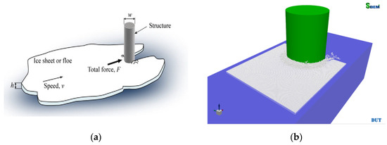 The interaction between sea ice and vertical structures: (a) schematic of sea ice interaction with vertical structures; (b) discrete element simulation of sea ice interaction with vertical structures.