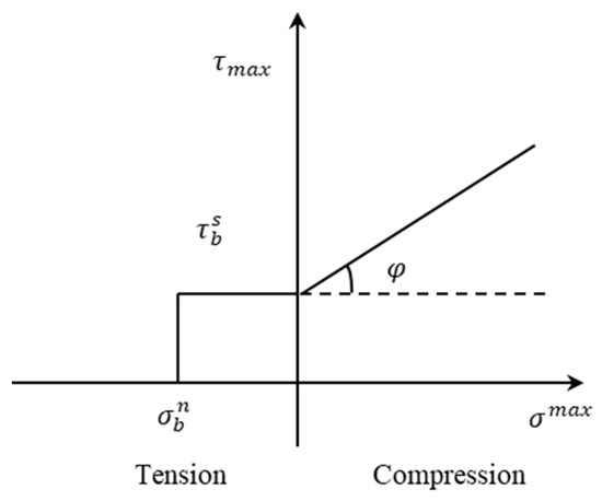 In the parallel bonding model, and represent the normal and tangential forces between particles, respectively, while and denote the normal and tangential moments between particles, respectively. The maximum tensile stress and maximum shear stress acting on the bonding disc can be expressed as follows:
