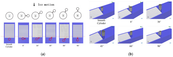 During the numerical simulation process, the dimensions chosen for the calculation domain of the level ice zone were 10 m × 7 m (length × width). Spring constraints were applied at the boundaries of the computational domain and between sea ice elements, with the stiffness of the springs set to be equal to the contact stiffness between the elements. Due to the presence of cable pipes, the support structure exhibits asymmetry. Therefore, simulations were conducted under different ice attack angles (defined as the angle between the ice normal and the structure centerline), including a 0° ice attack angle (vertical collision between the ice sheet and the side of the cable pipe and the support structure), 30° ice attack angle, 45° ice attack angle, 60° ice attack angle, and 90° ice attack angle (direct contact between the ice sheet and the front of the cable pipe). Additionally, scenarios without attached cable pipes were considered, resembling smooth cylinders. Ice thickness options were 0.2 m, 0.3 m, and 0.4 m (with an element diameter of 0.1 m), while ice velocities ranged from 0.01 to 0.1 m/s. The specific configurations are depicted in Figure 6.