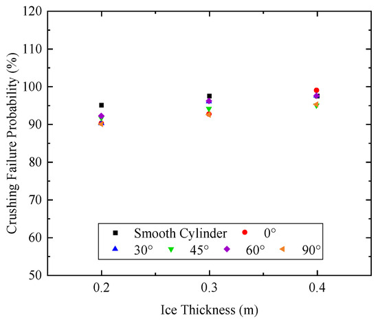 Probability of crushing failure of sea ice under constant ice velocity, constant ice attack angle, and different ice thicknesses.