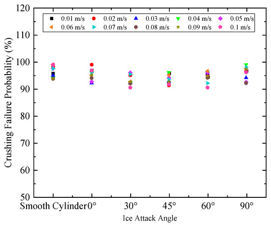 Probability of crushing failure of sea ice under constant ice thickness, constant ice attack angle, and different ice velocities.