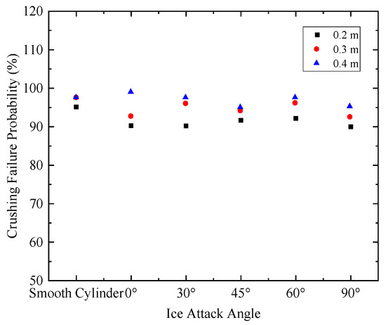 Probability of crushing failure of sea ice under constant ice thickness, constant ice velocity, and different ice attack angles.