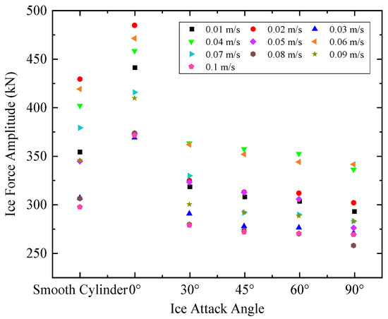 Ice force amplitude under constant ice thickness, constant ice velocity, and different ice attack angles.