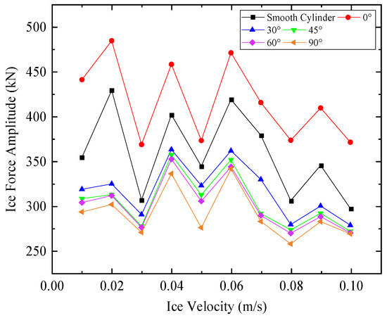 Ice force amplitude under constant ice thickness, constant ice attack angle, and different ice velocities.