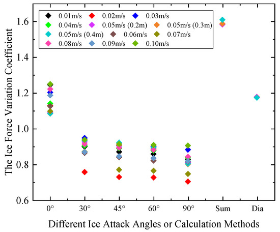 According to Formula (6), the ratio of the ice force amplitude obtained under different ice attack angles or calculation methods to the ice force amplitude of the smooth cylindrical pile legs is calculated, defining it as the ice force variation coefficient. The data in Table 4 and Table 5 are combined to calculate coefficient , and they are plotted in Figure 14. After excluding randomness, the mean is computed, and, finally, the calculation parameters of the ice load model for such structures are defined, as shown in Table 6.