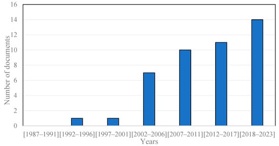 Figure 1 shows the literature trend for published documents using the terms “high-speed craft” and “human safety” in their abstracts for every five years from 1987 to 2023. Since the entirety of 2024 annual data is not yet available, it was not considered in this annual output. According to Figure 1, before 1992, safety on board HSPCs was not given as much attention, while the number of publications indicates an upward trend with time. Considering various reports of health risks on board these vessels [4,5,6], this upward trend demonstrates the increasing importance of the safety improvements of HSPCs.