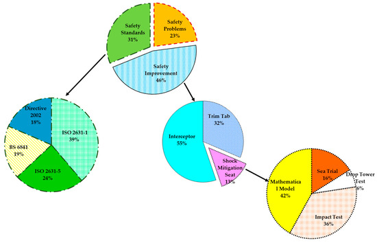 Figure 4 presents the percentage of documents found in each section of this review. According to this figure, 31% of existing research on HSPC safety evaluates human safety using current standards, and 46% focuses on improving safety. From all of the published studies on safety evaluations, the majority (39%) considered the ISO 2631-1 [15] standard as a safety regulation for humans exposed to WBVs.