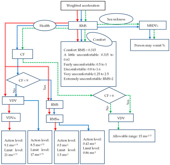where aw(t) is the frequency-weighted acceleration and T is the time period of the measurement. Figure 5 presents the safety evaluation process for different standards regarding the RMS and VDV values.