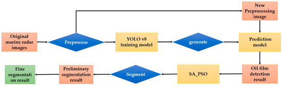The experimental process is shown in Figure 2. First, the original marine radar images were preprocessed. Afterwards, the preprocessed images were loaded into the YOLOv8 model for training to generate an oil film prediction model. Furthermore, the new preprocessed images were input into the prediction model to obtain the oil film detection result images. Then, the SA_PSO algorithm was used to preliminarily segment oil film targets. Finally, speckle noises were removed to obtain the final segmentation results.