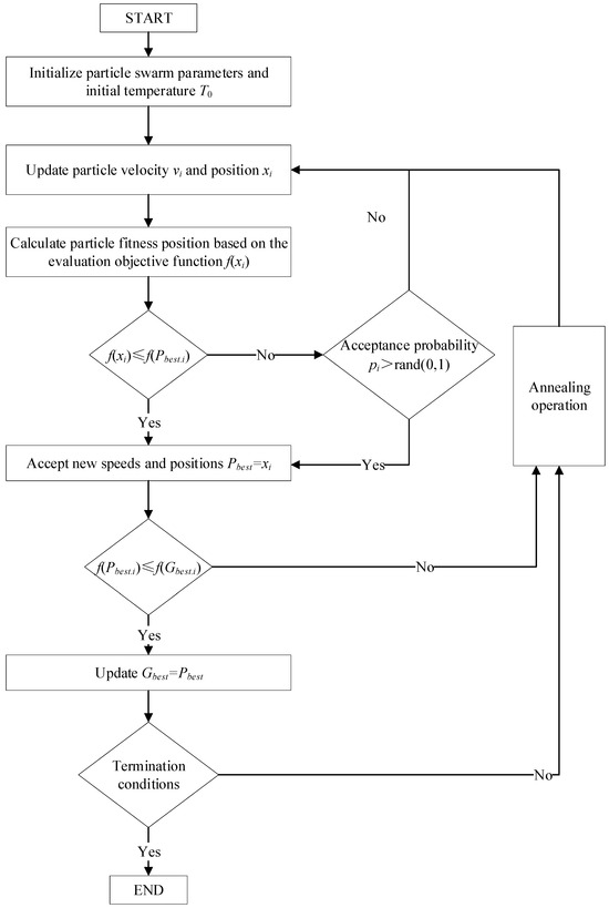 d. If f(xi) < f(Pbest.i), then set Pbest.i = xi. If f(xi) > f(Pbest.i), utilizing the above-mentioned simulated annealing acceptance probability pi to apply the Metropolis criterion [27]. If the probability pi is greater than a random number within the range [0, 1], then the state Pbest.i is still accepted. If this condition is not met, then the velocity vi and position xi will be recomputed.