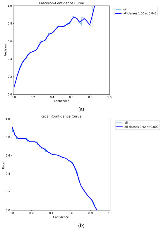 The Precision-Confidence Curve and the Recall-Confidence Curve are shown in Figure 8. As the confidence level increases, so does the accuracy of the model in detecting oil sheen. At a confidence threshold of ‘0.846’, the precision rate stood at ‘100%’, as reflected in Figure 8a. Due to insufficient sample size, the model may not be able to fully learn the distribution of data, resulting in unstable performance on validation or testing sets. This is the reason why the confidence curve oscillates between ‘0.6’ and ‘0.8’. The collection of oil spill data from maritime radar is an ongoing work in the future. The model’s ability to identify oil slicks improves as the single recall value increases. The model had a single recall of ‘0.92’, indicating that the model exhibits high accuracy in oil identification and localization, as shown in Figure 8b.