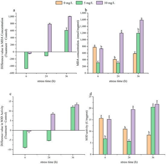 The SOD activity of both the 5 mg/L and 10 mg/L treatment groups exhibited an upward trend over time, with the most significant increase observed at 36 h. Specifically, the 5 mg/L treatment group saw an increase of 13.35 ± 0.86 U/mgprot, while the 10 mg/L treatment group experienced an increase of 12.08 ± 0.72 U/mgprot (Figure 1c). In the 5 mg/L ammonia nitrogen treatment group, the SOD activity in juvenile yellowfin tuna was significantly lower than that of the control group at both the 6-h and 24-h time points (p = 0.001), but it notably surpassed the control group’s level at the 36-h mark (p = 0.001, Figure 1d). Within the 10 mg/L treatment group, there was no significant difference in SOD activity compared to the control group at the 6-h mark (p = 0.425), but at both the 24-h and 36-h time points, the SOD activity in this group was significantly higher than that of the control group (p = 0.001).