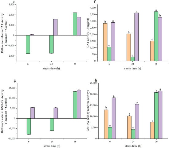 Effect of acute ammonia nitrogen stress on the antioxidant ability in the trunk kidney of juvenile yellowfin tuna (n = 9). (a) Difference value in malondialdehyde (MDA) concentration (treatment-control), (b) MDA concentration in treatment and control groups, (c) difference value in superoxide dismutase (SOD) activity (treatment-control), (d) SOD activity in treatment and control groups, (e) difference value in catalase (CAT) activity (treatment-control), (f) CAT activity in treatment and control groups, (g) difference value in glutathione peroxidase (GSH-PX) activity (treatment-control), (h) GSH-PX activity in treatment and control groups. The difference value = treatment value − control mean value. Different letters signify the significance of varying ammonia concentrations at the same time point (p < 0.05).