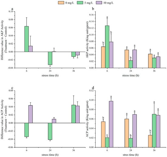 AKP activity in the 5 mg/L treatment group showed a decreasing and then increasing trend, with the greatest increase in AKP activity at 6 h, 0.063309434 ± 0.02163058 King units/gprot (Figure 2a). In the 5 mg/L ammonia nitrogen treatment group, AKP activity was significantly increased at the 6-h mark compared to the control group (p = 0.007), while, at the 24-h mark, it was found to be lower than the control level (p = 0.001). At the 36-h mark, no significant difference was observed compared to the control group (p = 0.095, Figure 2b). The AKP activity in the 10 mg/L treatment group exhibited a decreasing trend over time, with the largest reduction observed at 36 h, amounting to a decrease of 0.01 ± 0.01 King unit/gprot. Conversely, in the 10 mg/L treatment group, no significant differences were detected in AKP activity compared to the control group during the 6- to 36-h period (p = 0.397 at 6 h, p = 0.934 at 24 h, and p = 0.225 at 36 h).