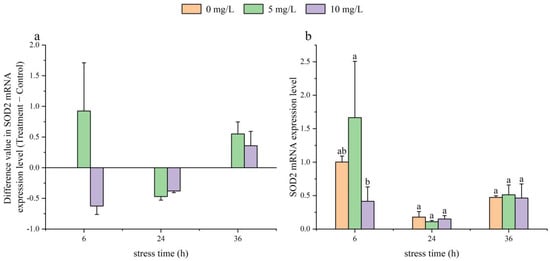 In the 5 mg/L treatment group, the expression levels of SOD2 initially declined and subsequently demonstrated an upward trajectory over the course of the study (Figure 3a). In the 5 mg/L ammonia nitrogen treatment group, the relative expression of the SOD2 gene in juvenile yellowfin tuna was comparable to that of the control group at the 6-h mark (p = 0.201, Figure 3b), but it significantly decreased at the 24-h mark (p = 0.001) and then surpassed the control group’s level at the 36-h mark (p = 0.009). In the 10 mg/L treatment group, the expression of SOD2 exhibited a consistent increase over the temporal progression. In the 10 mg/L treatment group, the SOD2 gene expression showed no significant difference from the control group at the 6-h mark (p = 0.206), was lower than the control at the 24-h mark (p = 0.004), and finally significantly exceeded the control group at the 36-h mark (p = 0.05).