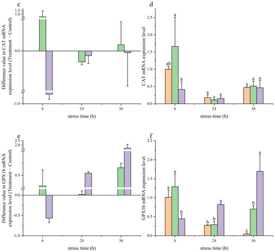 Effects of acute ammonia nitrogen stress on antioxidant genes in the head kidney of juvenile yellowfin tuna (n = 9). (a) Difference value in superoxide dismutase 2 (SOD2) mRNA expression level (treatment-control), (b) SOD2 mRNA expression level in treatment and control groups, (c) difference value in catalase (CAT) mRNA expression level (treatment-control), (d) CAT mRNA expression level in treatment and control groups, (e) difference value in glutathione peroxidase 1b (GPX1b) mRNA expression level (treatment-control), (f) GPX1b mRNA expression level in treatment and control groups. The difference value = treatment value − control mean value. Different letters signify the significance of varying ammonia concentrations at the same time point (p < 0.05).