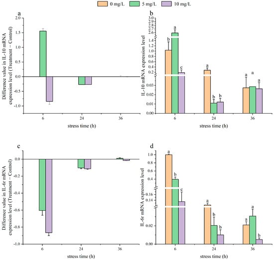 IL-10 showed a trend of first decreasing and then increasing over time in the treatment group with a concentration of 5 mg/L (Figure 4a). In the 5 mg/L treatment group, the relative expression level of the IL-10 gene in juvenile yellowfin tuna was significantly higher than that of the control group at the 6-h mark (p = 0.001), but it was significantly lower at the 24-h mark (p = 0.001). By 36 h, there was no significant difference in expression levels compared to the control group (p = 0.944, Figure 4b). IL-10 demonstrated an increasing trend over time in the treatment group with a concentration of 10 mg/L. In the 10 mg/L treatment group, the IL-10 gene expression was significantly lower than the control group at both the 6-h (p = 0.002) and 24-h (p = 0.001) time points, but by 36 h, there was no significant difference from the control group (p = 0.955).