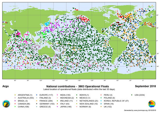 Global map of operational Core Argo floats, by nation, in September 2018 (Source: JCOMMOPS).