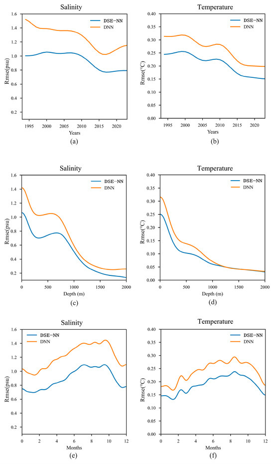 RMSE (root mean square error) is a commonly used statistical measure for assessing the difference between the model’s predicted values and the actual observed values. DSE-NN and DNN (without space discretization) present significant differences in salinity and temperature interpolation, with the results also varying based on different years, depths, and months of a year. Figure 3 demonstrates the loss curve results, comparing the DSE-NN and DNN curves from different aspects.