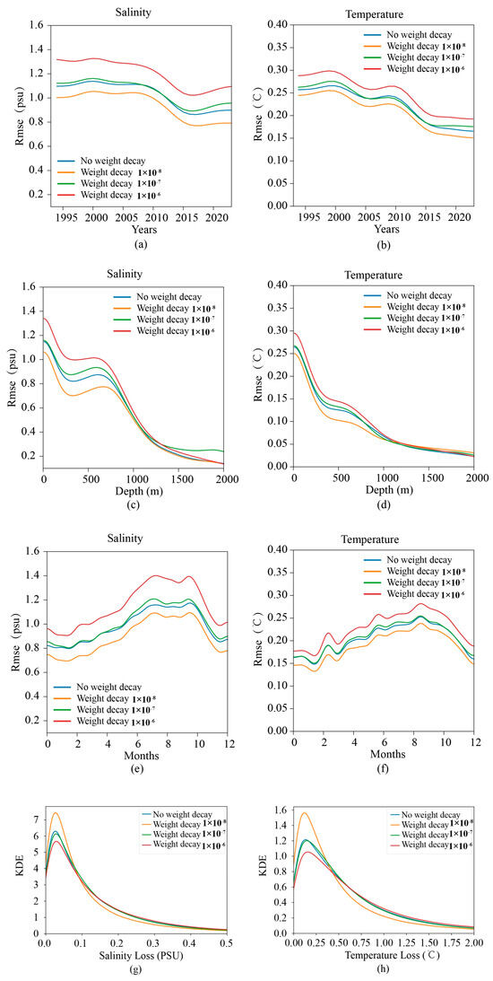 As a result, in terms of salinity loss, the weight decay of 1 × 10−8 had the highest KDE, followed by no weight decay, weight decay of 1 × 10−7, and weight decay of 1 × 10−6. Between 0.0 and 0.1 salinity loss, there is a narrow curve, meaning that the effect is better. A similar trend can be seen when the temperature loss is between 0.0 and 0.25 (Figure 7g,h).