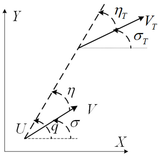 Here, and V are the velocities of the target and UIV, respectively; is the angle between the target velocity vector and the baseline; is the angle between the target velocity vector and the sight line, called the target leading angle; is the angle between the UIV’s velocity vector and the sight line, called the UIV’s leading angle; is the angle between the UIV’s velocity vector and the baseline; r is the distance between the UIV and the target; a is the UIV’s normal acceleration, which is the control input.
