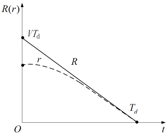 In [8], the missile attack timing control problem is transformed into a tracking problem of the expected distance between the missile and the target. The expected missile-to-target distance is shown in Figure 3, where the solid line represents the designed expected missile-to-target distance R, and the dotted line represents the actual tracking distance curve between the missile and the target. The relationship between the expected missile-to-target distance and is