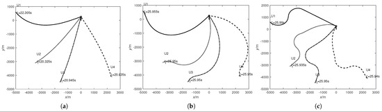 Figure 6 shows the flight trajectories of the four UIVs and the target, with the end of each trajectory indicating the actual attack time for each UIV. Figure 6a shows the flight trajectories when proportional guidance is employed, with each trajectory representing the path taken by the UIV to reach the target. Figure 6b displays the flight trajectories with the navigation path when the proposed guidance law (including target motion compensation in the feedback control) is employed without maneuvering by the UIVs. In Figure 6c, the UIV employs the proposed segmentation control strategy in addition to the guidance law, allowing for both time control and maneuvering. It is clear from the simulation results that the flight paths in Figure 6a are the smoothest, followed by the ones in Figure 6b, and then those in Figure 6c. The more maneuvering the UIV performs, the more curved its flight path becomes. This is mainly because the guidance law with time control causes the UIVs to consume more time, which is not required, to achieve simultaneous attacks.