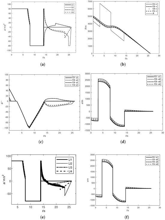 (1) The range of values for : . The minimum value of in this guidance algorithm cannot be zero. means that there is no segmented control in the guidance process of the UIV. That is, there is no evasion maneuver guidance in the first stage. The maximum value of cannot exceed the fixed impact time . If , then the entire course of the UIVs’ guidance process in their own maneuvering navigation cannot precisely hit the target.Considering the generalization of the guidance algorithm, and based on the simulation data, the maximum value of is determined. When exceeds , while it can extend the range of evasive maneuvers of the UIV, it will reduce the accuracy of impact time control, which is not in line with actual operational requirements.