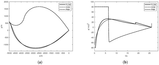 From Figure 8a, it can be observed that all three methods can adjust the navigation time by maneuvering appropriately. The trajectories of the FLCM and the OCM are quite similar, while the PNM yields slightly curved trajectories, implying that larger control inputs are required for UIV during time control, as corroborated in Figure 8b, where PNM exhibits substantial control inputs at the outset. Compared with the other two methods, the FLCM adjusts the attitude relatively faster at the initiation of guidance but at the expense of greater control inputs. Throughout the guidance process, the variation in control inputs is relatively smooth, aiding in alleviating the burden on the guidance system and enhancing system stability, particularly towards the end of guidance, where there is no tendency for control inputs to increase, as observed in the optimal control method, further demonstrating the superiority of the approach proposed in this paper.