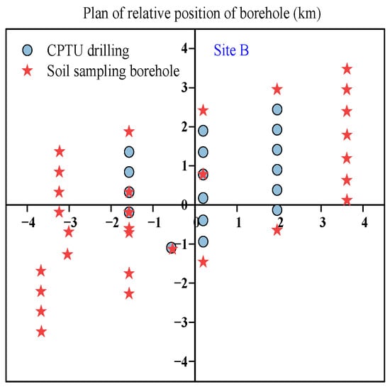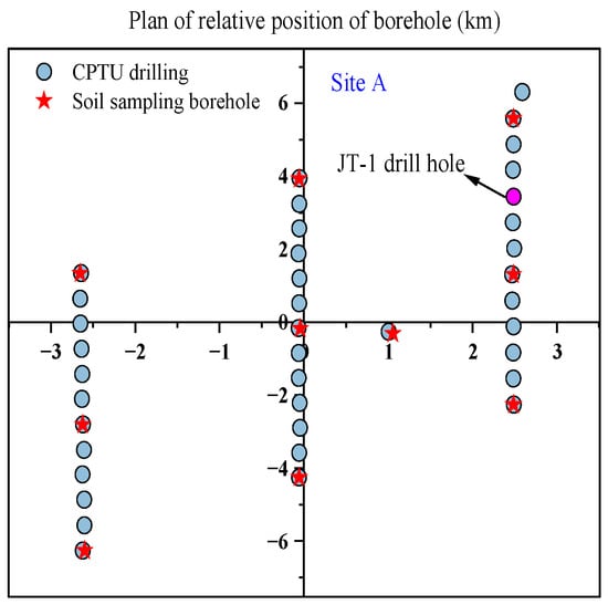 As depicted in Figure 1, the experimental sites A and B are located in the eastern sea area of Cangnan and the southeastern sea area of Xiangshan in Zhejiang Province, China, respectively. Figure 2 and Figure 3 illustrate the distribution of drilling holes at sites A and B. Throughout the CPTU drilling process, parameters such as “total” cone tip resistance (qt), sleeve friction (fs), and pore water pressure at the cone shoulder (u2) were continuously measured with a data acquisition interval not exceeding 100 mm. At site A, there were 39 CPTU boreholes and 10 soil sampling holes, from which 202 soil samples were collected, and 68 sets of laboratory consolidated quick direct shear tests were conducted. Figure 4 displays the soil profile data of the CPTU borehole log section No. JT-1 along the depth direction at site A. The upper sediment at site A primarily consists of Quaternary (Q4) shallow marine deposits, including mud, muddy silty clay, silt, sandy silt, and silty clay. The lower sediment comprises Late Pleistocene (Q32) deposits from terrestrial and coastal environments, mainly composed of silt, silty clay, and sandy silt within the depth range of the exploration. At site B, there were 19 CPTU test holes and 28 soil sampling holes, from which 484 soil samples were collected, and 68 sets of laboratory consolidated quick direct shear tests were performed. The upper sediment at site B primarily consists of Quaternary (Q4) shallow marine deposits, including mud, muddy silty clay, sandy silt, silt, silty clay, and gravel. The lower sediment consists of Late Pleistocene (Q32) deposits from estuarine and coastal environments, characterized by sandy silt and silty clay within the depth range of the exploration. In summary, the geological conditions of experimental sites A and B are relatively similar. We first proposed an undrained shear strength formula based on CPTU results derived from the data of experimental site A and then verified it using the data from experimental site B. Table 2 presents the types and quantities of soil layers studied at experimental sites A and B.