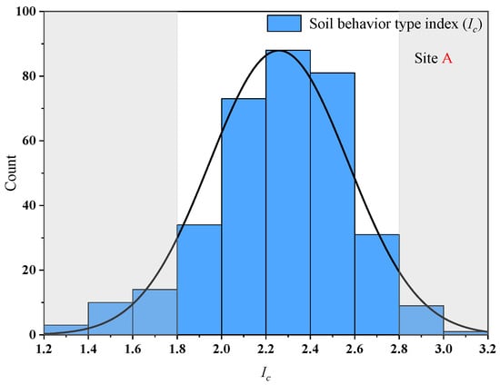 Data extraction was first performed on the test results from 39 CPTU boreholes at experimental site A. After eliminating data from sand layers and surface mucky layers, 344 soil layer data were obtained. The histogram in Figure 5 displays the distribution of Ic data. Figure 6 shows the results of the selection of 280 soil layer data. To minimize random errors, this study focused on the range [1.8, 2.8], which has a dense distribution of Ic data. Figure 6 shows that the data points are relatively discrete and cannot form a functional relationship.