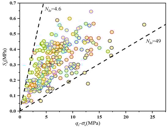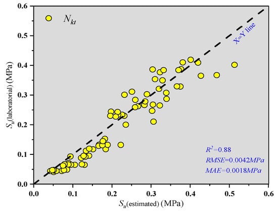 According to Equation (9), the average value of Nkt in the soil behavior type index Ic range of 1.8 to 2.8 is 21.76, which is close to the statistical average value of 17.9 obtained by the consolidated quick direct shear test specified in the Technical Code for Static Penetration Test in Water Transportation Engineering of China [21]. According to Table 2, the study involved various types and numbers of soil layers. However, the lack of clay layers may result in an overestimation of the calculated value of Nkt in the formula. Furthermore, research conducted in the marine areas near Hangzhou Bay, Hangzhou City, Zhejiang Province, China, indicates that the consolidated quick direct shear tests conducted in this region yielded an overall average value of 20.25 for the cone tip factor (Nkt) in terms of undrained shear strength [36]. This further corroborates the reliability of the formula in the marine areas adjacent to Zhejiang Province, China.