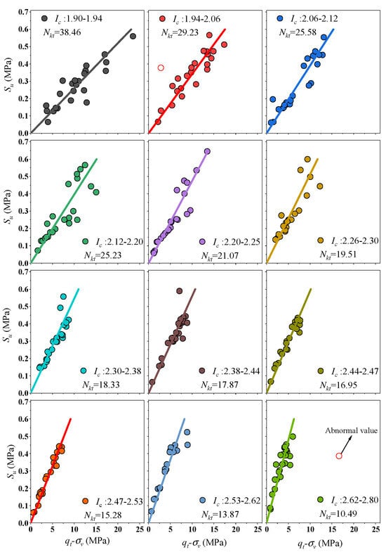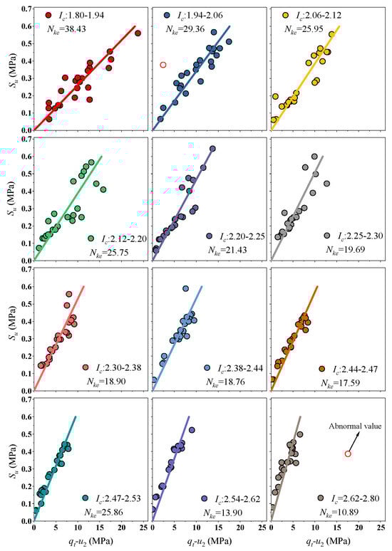 To investigate the functional relationship between the related variables (qt-σv, Su), 280 soil samples were divided into 12 groups based on the magnitude of Ic. Each group contained 23 soil samples, except for the last one, as shown in Figure 7. Two clear outliers were excluded based on observation. The results indicate a linear relationship between these variables, as demonstrated by the coefficient of determination R2 in Table 3. All results, except for Ic ranging from 2.12 to 2.22, indicate good fitting effectiveness, with values larger than 0.95. Additionally, using the method described above, the relationship between qt-u2 and Su can be determined (see Figure 8 and Table 3).